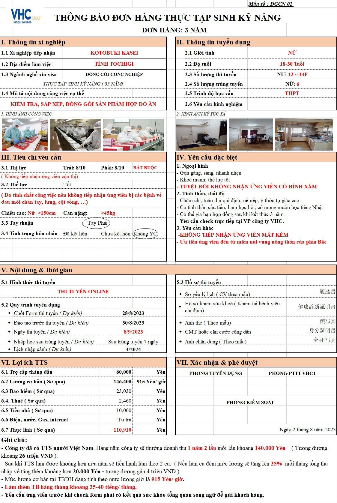 12-14 NỮ ĐÓNG GÓI CÔNG NGHIỆP TOCHIGI 28/8/23 Hạn tuyển: 28/08/2023 Ứng tuyển Lương: 19 triệu VNĐ ~ Nơi làm việc: TOCHIGI ĐÓNG GÓI CÔNG NGHIỆP Bài viết liên quan23/04/202415/06 AOMORI 40F NỮ CHẾ BIẾN THỰC PHẨM22/04/202409/05 AICHI 3F NAM GIA CÔNG KIM LOẠI15/04/202425/04 KANAGAWA 2F NAM TRÁT VỮA