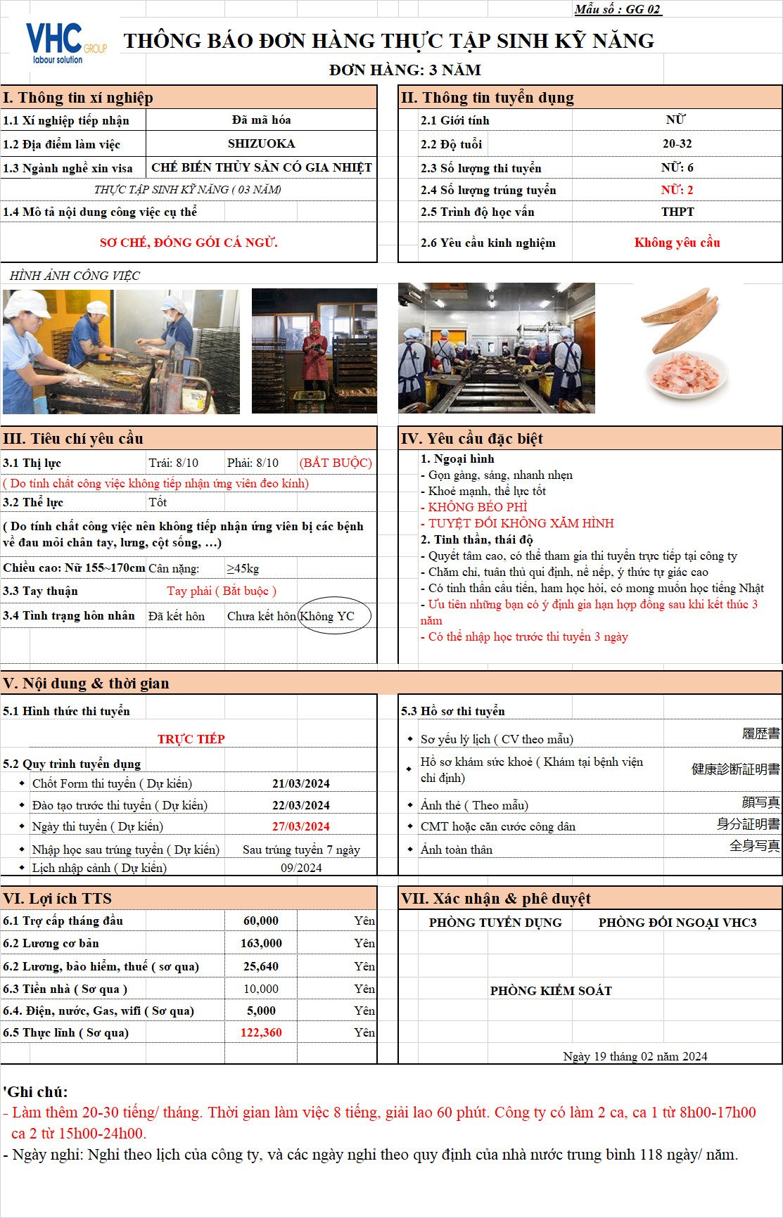 27.03.24 SHIZUOKA 6F NỮ CHẾ BIẾN THỦY SẢN GIA NHIỆT Hạn tuyển: 21/03/2024 Ứng tuyển Lương: 19 triệu VNĐ ~ Nơi làm việc: SHIZUOKA Chế biến thủy sản gia nhiệt Bài viết liên quan23/04/202415/06 AOMORI 40F NỮ CHẾ BIẾN THỰC PHẨM22/04/202409/05 AICHI 3F NAM GIA CÔNG KIM LOẠI15/04/202425/04 KANAGAWA 2F NAM TRÁT VỮA