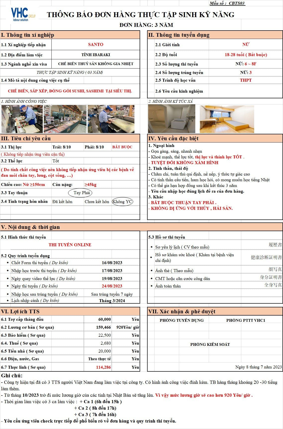 6-8 NỮ CHẾ BIẾN SUSHI SAHIMI SIÊU THỊ IBARAKI 24/08/23 Hạn tuyển: Ứng tuyển Lương: 18 Triệu VNĐ ~ Nơi làm việc: IBARAKI CHẾ BIẾN THỰC PHẨM Bài viết liên quan23/04/202415/06 AOMORI 40F NỮ CHẾ BIẾN THỰC PHẨM22/04/202409/05 AICHI 3F NAM GIA CÔNG KIM LOẠI15/04/202425/04 KANAGAWA 2F NAM TRÁT VỮA
